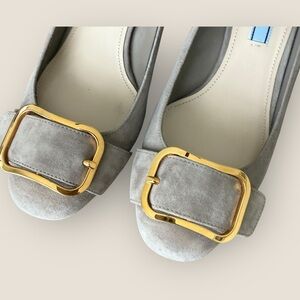 SEO keywords: Prada pumps, vintage Prada shoes, grey suede heels, designer heels, gold buckle pumps, block heel suede shoes