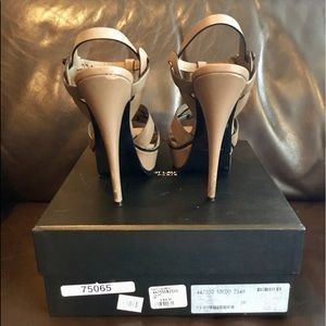 EXCELLENT CONDITION high heel leather sandal with wide intertwined straps. Adjustable ankle strap with a covered heel. Approx 5 1/4” heel with 1” platform. These shoes are ICONIC! They are also comfortable and easy to walk in. Slight wear on the strap and heels, but barely noticeable. Actual shade is a slightly darker neutral. Last photo is closest to the shade.