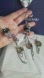 The large disk is a grey silver shadow color and there are purple and amethyst crystals as well. The matching dangling earrings have the silver shadow disks among chains.