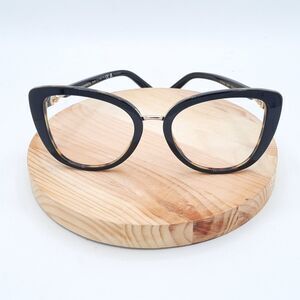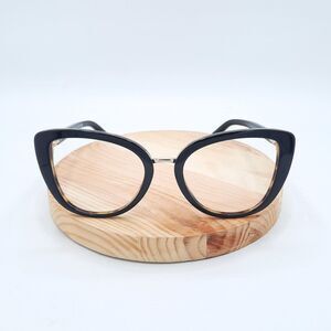 Classic Shiny Black on Tortoise Cat-Eye style plastic frame with decorative gold metal bridge and hinges. These come with demo lenses, but these frames can be customized to your prescription.