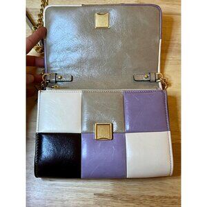 Beautiful Soft Quilted Leather in a Patchwork Pattern consisting of Winter White/Crem, Purple, Maroon and Tan, Gold Hardware and a Detachable Strap