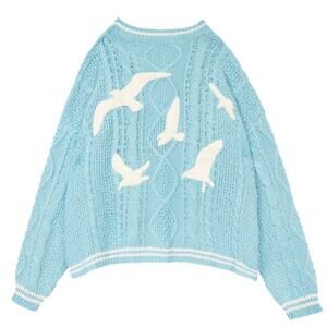 other: 5 embroidered seagulls on back, 1989 logo embroidered on front, T.S. patch on front near hem, 3 button closure, oversized fit, slightly open knit, cable knit texture, limited edition, authentic, no longer available.