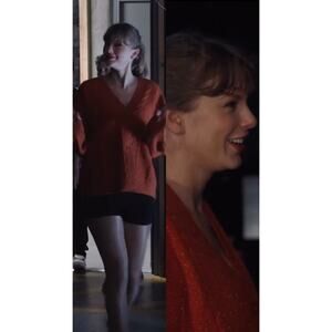 * Orange tonal lurex cable knit cardigan featuring orange glitter buttons, 12 lurex embroidered stars on arms, and "T.S." in lurex embroidery on wearer's front left chest.