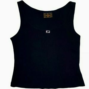 BEAUTIFUL BLACK AUTHENTIC VINTAGE SILVER HARDWARE FF LOGO TANK TOP BLACK . IT HAS STRETCH ,COLLARLESS. COTTON 95% LYCRA 5% MADE IN ITALY. PLEASE LOOK AT PICTURES LOTS OF LIFE LEFT. THIS IS A GORGEOUS FENDI TANK TOP PIT TO PIT 40cm/16 SHOULDER TO HEM 47cm/18.5 in.
