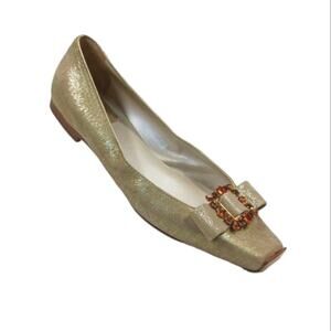 Stunning Christian Dior ballerina flats by Gianfranco Ferre in beige/gold shimmer canvas. The refined elegant design is completed with a flat bow encrusted with citrine-style rhinestones.