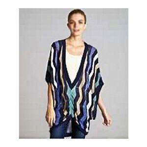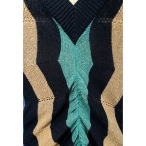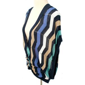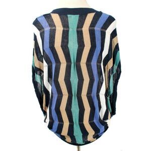 Unique Autumn Cashmere navy blue, tan, white blue & green zig-zag chevron stripe Flame Stitch knit sweater top. Linen blend. Slight high low with a ruched front. Deep v-neckline. Kimono style sleeve. Open woven-knit detail. Oversize fit. Missoni -vibes. Great pre-owned condition.