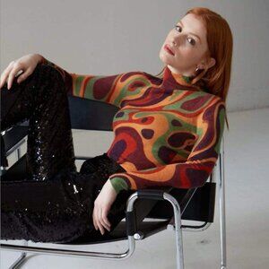 The Sheer Marble Print Mock Neck Sweater by Autumn Cashmere is a statement-making knit that will add a bold pop of color to any look. Crafted from cashmere for a luxurious feel, this mock neck sweater features a 70s-inspired multi-color marble knit pattern and a slim silhouette. Tuck into high-waisted denim for an effortlessly styled look.