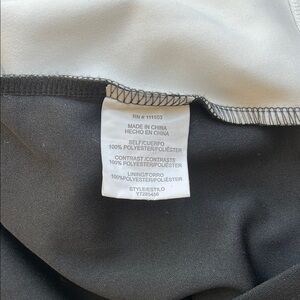 Chic midi dress with a faux wrap design. Features a striking black and white contrast. Perfect for elegant occasions.