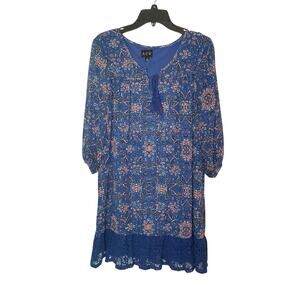 This charming A.U.W bohemian-style dress features a vibrant blue floral print with pink and navy accents. It has a tassel tie neckline, 3/4 length sleeves, and a crocheted lace hemline that adds a feminine touch. The relaxed fit and lightweight fabric make it perfect for year-round wear — pair with boots and a hat for fall, or sandals for spring.