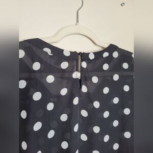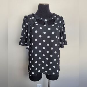Very cute and flattering blouse with a fun polka dot print and an interesting strappy cutout collar. Button and loop closure with feminine Flounce sleeves. Small snag on front shown in photo. Tagged size medium measures approximately 24 inches long 21 inches underarm to underarm laid flat.