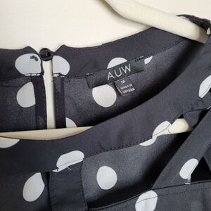 A.U.W. Polka Dot Blouse Black White Strappy Flounce Sleeve Teacher Office Medium