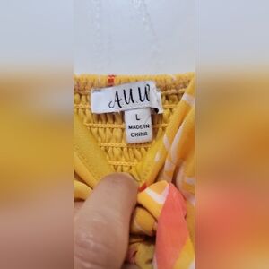 AUW Women's Yellow Floral Boho Fun & Flirty, Padded Bra Dress Sz large . The dress features a sweetheart neckline and a pullover closure. It is lined and has a smocked design. The dress is perfect for party or casual occasions . The dress is yellow in color and has a floral pattern, making it a great choice for summer, fall, or spring.