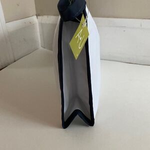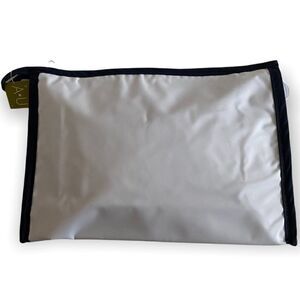 AU White with Blue Trim Womens Toiletry Bag. Full zipper closure with small handle. Two inside pockets. Nylon lined inside. Made in USA