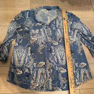 The product is a women's blue long sleeve blouse by AVA & GRACE in size large. It features a pullover closure and a regular fit, making it a versatile and comfortable top for everyday wear. The long sleeves add a touch of sophistication, while the blue color adds a pop of brightness to any outfit. Perfect for pairing with jeans or trousers, this blouse is a stylish addition to any woman's wardrobe.