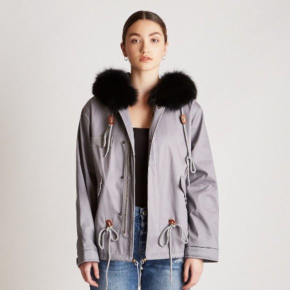 Parka Jacket with black embroidery design on back. Detachable Fox Fur Trim