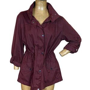 AVA VIV Burgundy Full Zip/Snap Jacket. Sleeves roll up and snap. Drawstring on inside to cinch up waist. Two front pockets. Hidden hood zips out of collar when needed.