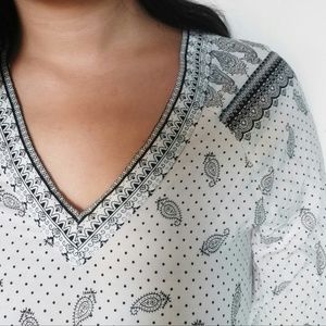 Detail: cinched ballon sleeves, v-neck line, cute navy blue paisley and polkadot print, breathable fabric, rushing stitch around hip area