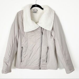 Avalanche Fleece Lined Coat/Jacket. Asymmetrical moto zip. Small. Soft lining. Grey/cream shade. Light-medium weight. Zippered pockets. Excellent pre-owned condition.