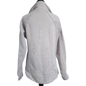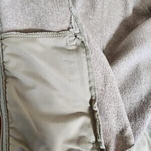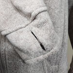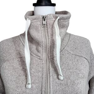 Oatmeal color full zip knit jacket, funnel neck with drawstring, 2 side zip pockets, thumbhole cuffs. Size L.