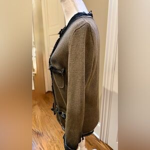 Elegant knitwear by Avant toi. Bronze buttons. This is linen with denim trim. This has a distressed look. The color is a gray brown with dark blue trim.