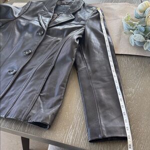 Chic and timeless mid-length leather jacket. Features a button-up front and crafted with buttery soft leather Ideal for versatile styling.