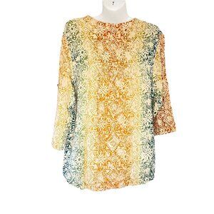 Avec Bohemian Peasant Top V-Neck with String Tie and Tassels, Turquoise, Green, Gold, Red Indian Floral Block Print. Flowy Gauze with 3/4 Sleeve that can be worn down or rolled up with button tab (mother-of-pearl buttons). High Low Hem.