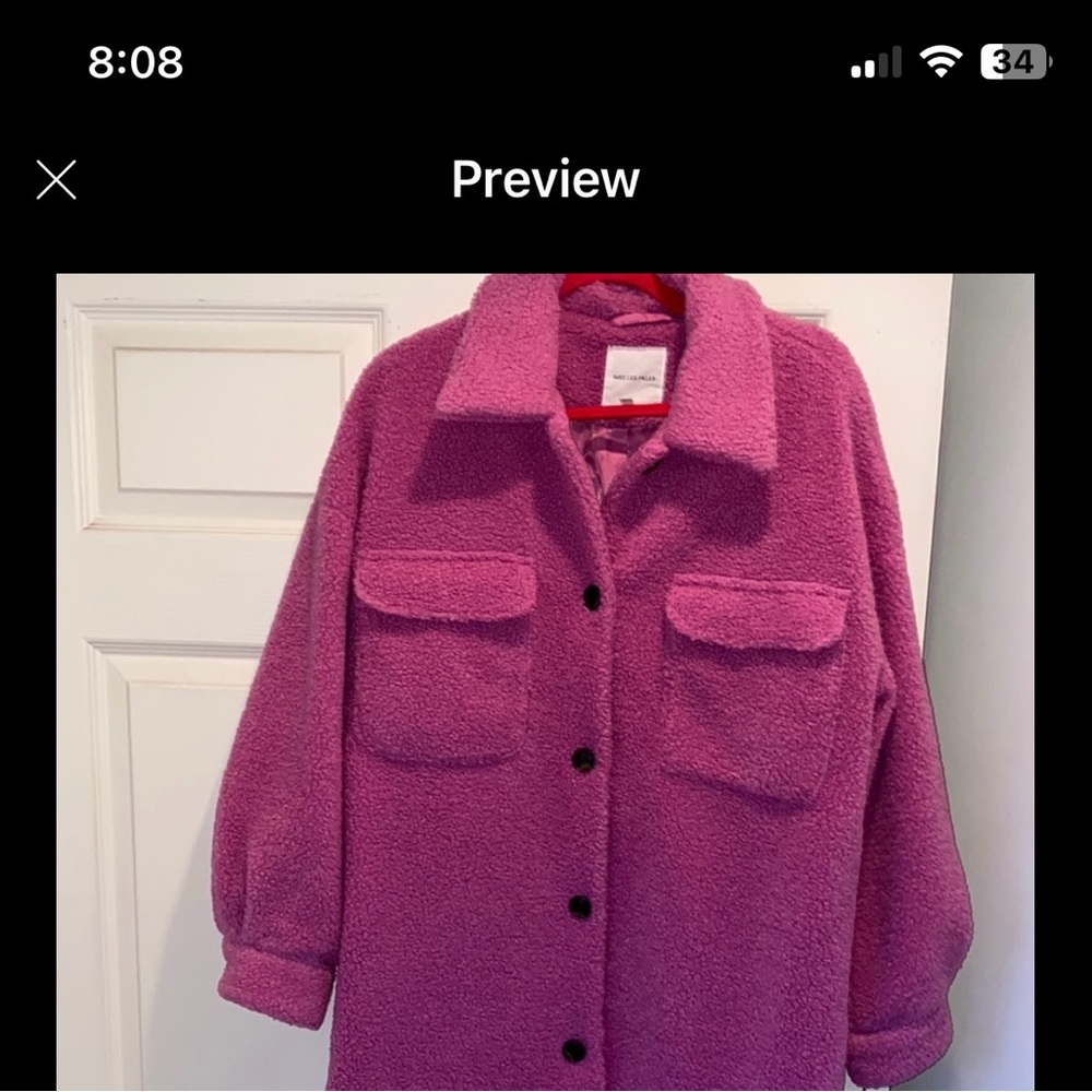 Stunning warm casual shirt style coat. Polyester with polyester lining. 32 inches long, 46 inches armpit to armpit, sleeves from shoulder to cuff is 27 1/2 inches long. Not true to size (S) I am a size 12 fits me perfectly see measurement description. Worn once.