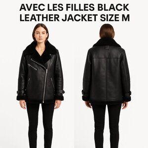 avec les filles jacket, black leather moto jacket, shearling lined jacket, women’s medium leather jacket, oversized moto coat, aviator jacket women, faux shearling biker jacket, edgy street style outerwear, parisian chic leather jacket, avec les filles outerwear, luxe moto jacket, belted cuff leather jacket, asymmetrical zip coat, black winter leather jacket, avec les filles size M