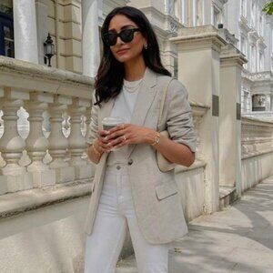 Tags: linen blend blazer, cream women's blazer, AVEC LES FILLES, single button blazer, front pockets blazer, women's M blazer, cream linen jacket, ladies cream blazer, elegant cream blazer, linen blend jacket, smart casual blazer, stylish women's blazer, women's office blazer, Boyfriend