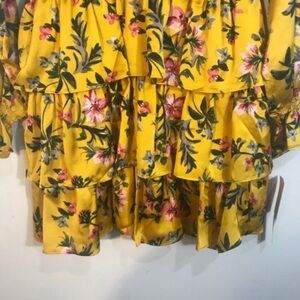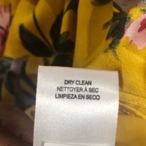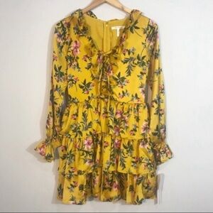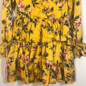 Lovely A-line v-neck silky dress with all over floral print and ruffle detail. Optional tie front with drawstring lace up detail. Long sleeves with elasticized ruffle cuffs. Concealed back zip. Lined