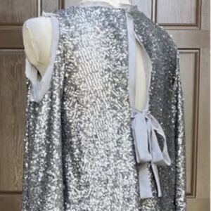 This show-stopping open shoulder, open back, hi/lo sequin top is so feminine that all eyes will be on you. Ribbons, sequins, sparkle...what more could a girl ask for? The small sequins resemble scales that lend an art deco effect to this very cool top. Size Medium. NWT.