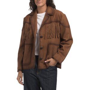 Brand New Color: bourbon fringe trim, stitch trim, 2 front pockets, fully lined hits at hip mid weight notch collar, button front closure suede/cotton/polyester imported professional leather clean