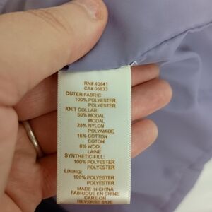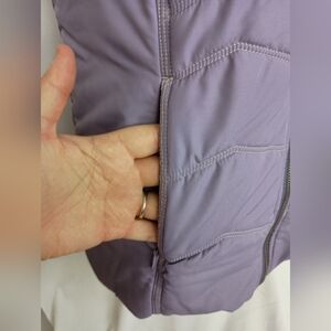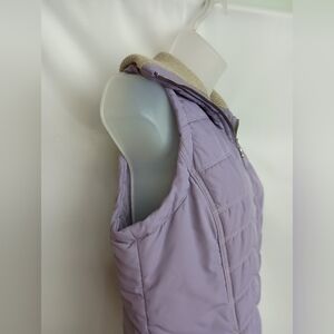 Chic quilted vest in lavender. Features a stylish tan collar. Ideal for layering.