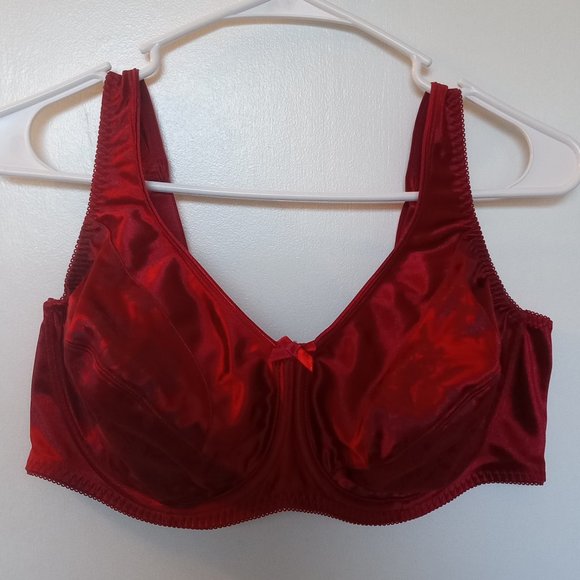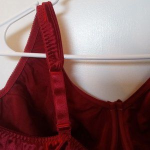This Cranberry red women's underwire bra is a size 46C, and was made of 8% Spandex and 92% Nylon (exclusive of trim). It was made in China. It has decorative edging, and the bust part of it has a floral two-toned decorative print on it. It is in excellent condition. It has 3 rows of 2 hooks, and the straps are adjustable too. HAND WASH, NO BLEACH. LINE DRY, NO IRON..