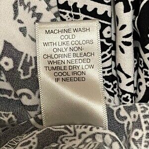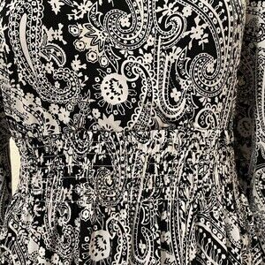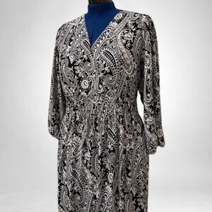 Beautiful black and white paisley print knit dress by Avenue. V-neckline with a wrap style front. Elastic smocking at waist. Flowy sleeves with elastic at wrist. Very good condition from a non smoking/pet friendly home
