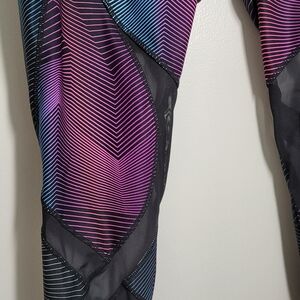 These geometric capri leggings feature a dynamic multicolor pattern, perfect for playful days and gym workouts.