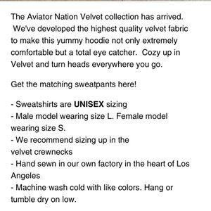 Please see final picture taken from Aviator Nation online. This crewneck velvet/velour sweatshirt is so silky soft and the color...WOW! These have been sitting in my son's closet for some time and we decided to let this beauty go! Your win!
