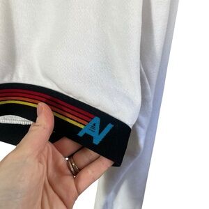 AVIATOR NATION Logo Stripe Crop Pullover Hoodie Sweatshirt. The most comfortable hoodie you'll ever own. Our single needle stitch work gives each garment a unique, one of a kind effect. All of our products go through an intense breaking-down process that gives them a vintage feel you'll love because it's broken in from day one of wearing it. You're going to live in this hoodie. Hand sewn in our own factory in the heart of Los Angeles. Hoodies are UNISEX sizing. Back tag says “M” while inside fabric tag says “L”. This hoodie is definitely a Medium.