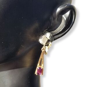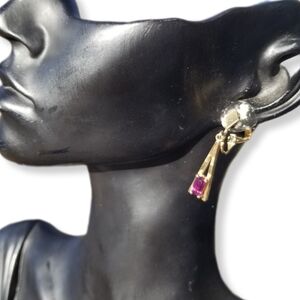 Beautiful vintage earrings by Avon from the 1975 collection "Plaza IV". Earrings have a unique goldtoned A frame design accented with a purple amethyst color glass jewel. Earrings measure 1-1/2 inches tall, they are drop style with clip on style backs. Excellent condition