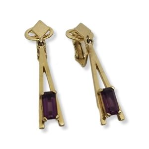 AVON 1975 "PLAZA IV" FAUX AMETHYST & GOLDTONE A FRAME DESIGN DROP CLIP EARRINGS