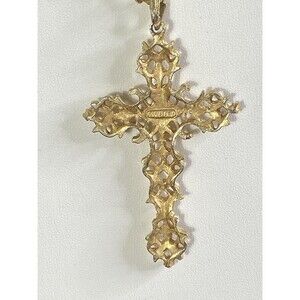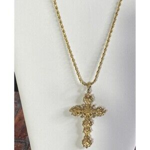 The AVON Abbey Cross Gold Tone Ruby Red Cabochon Pendant with an 18 Twisted Necklace is a vintage piece of fashion jewelry for women. The pendant features a cross shape with a ruby red glass cabochon as the main stone. Signed by Avon, this pendant is a unique and religious-themed accessory that would make a statement for any occasion. The gold tone color adds a touch of elegance to the piece, making it a must-have addition to any jewelry collection.