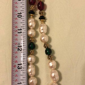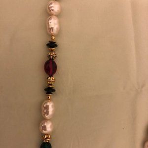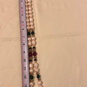 Pearls, red and green gems, gold beads and Black Onyx gems. Very rich in color.