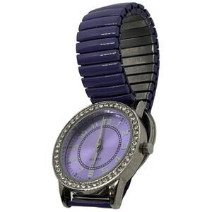 The watch is being sold in untested condition, so battery replacement may be needed. The expandable band maintains good elasticity, and the crystal bezel retains its sparkle. The stainless steel case back ensures durability, while the comfortable stretch band eliminates the need for clasps or sizing. The monochromatic purple color scheme with silver accents creates a sophisticated look perfect for both casual and dressy occasions. The combination of functionality and fashion makes this timepiece a versatile accessory.