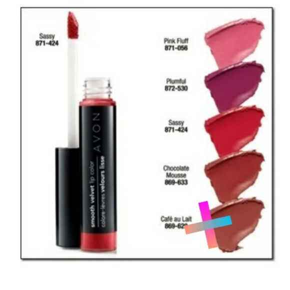 Avon smooth velvet lip color. New. In sassy, chocolate mousse, plumfuln and pink fluff. All in original packaging unopened. pink fluff opened but never used. WANT multiples, let me know to create seperate listing so you only pay one shipping cost.