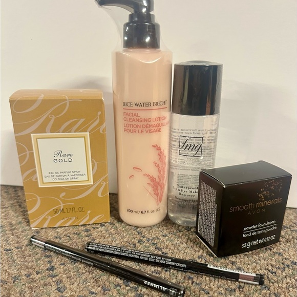 Rare Gold perfume, rice-water brightening facial cleansing lotion, makeup remover, powder foundation, two eyeliners. Please refer to photos for description of each item. All items are brand new in original packaging. All items come from smoke free, pet free home