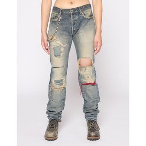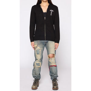 Features beautiful sashiko details and distressing with red yarn accentuation.
