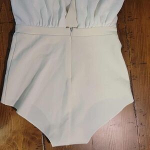 This is a white/off-white A.W.A.K.E Mode Twisted Asymmetric Crepe Bodysuit with a zipper in the back and buttons at the bottom. This bodysuit measures 30 inches in length, 16 inches from armpit to armpit, and 12.5 inches at the waist. This bodysuit does not have tags, but does not appear to have any sort of wear either.
