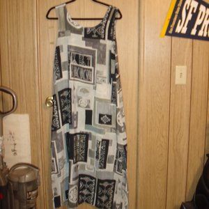 AWESOME WEAR MADE IN USA 100% POLYESTER, SLEEVELESS DRESS, GREAT CONDITION BLACK & GRAY PATTERNS, SIZE MEDIUM ROUND NECKLINE, MEASURES: ARMPIT TO ARMPIT 18", SHOULDER TO BOTTOM 50", SLIT ON BOTH BOTTOM SIDES ABOUT 16".