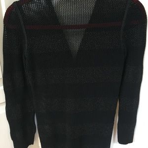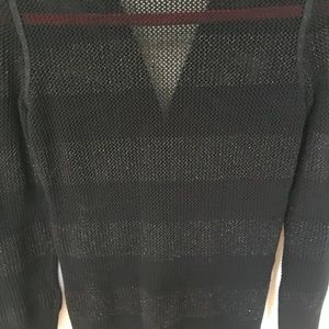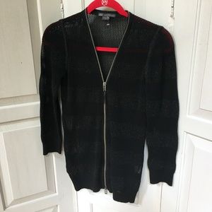 Stylish black open knit sweater with a zip front. Sweater has subtle stripes and metallic threading for a subtle sparkle. Ribbed cuffs and waistband. Has stretch. Perfect for layering. Elegant and versatile.