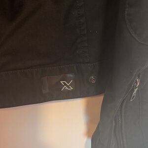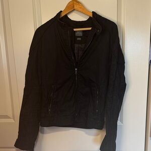 Stylish dark bomber moto biker jacket with zip front. Features sleek pockets. Perfect for everyday wear.
